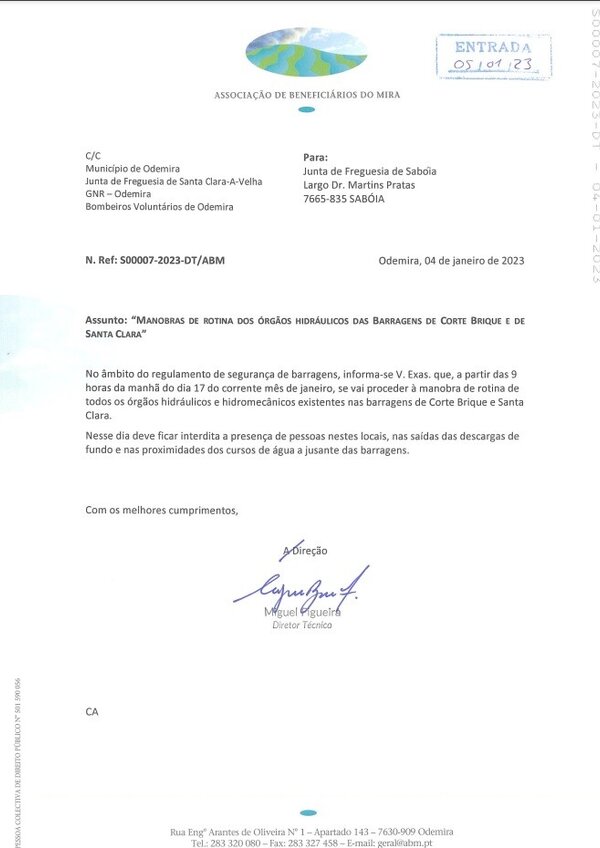 Manobras de rotina dos órgãos hidráulicos das barragens de Corte Brique e Santa Clara